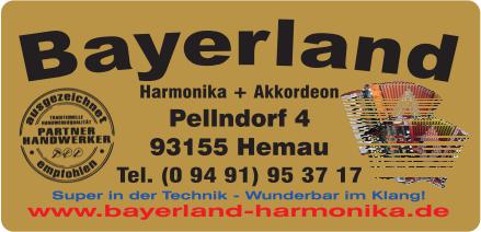 Außerdem Vertriebstützpunkt für Bayerland Harmonikas und Akkordeons. Immer Harmonikas zum Ausprobieren vorrätig, vorwiegend in den Tonarten GCFB, auch jede andere Tonart kurzfristig vorhanden.